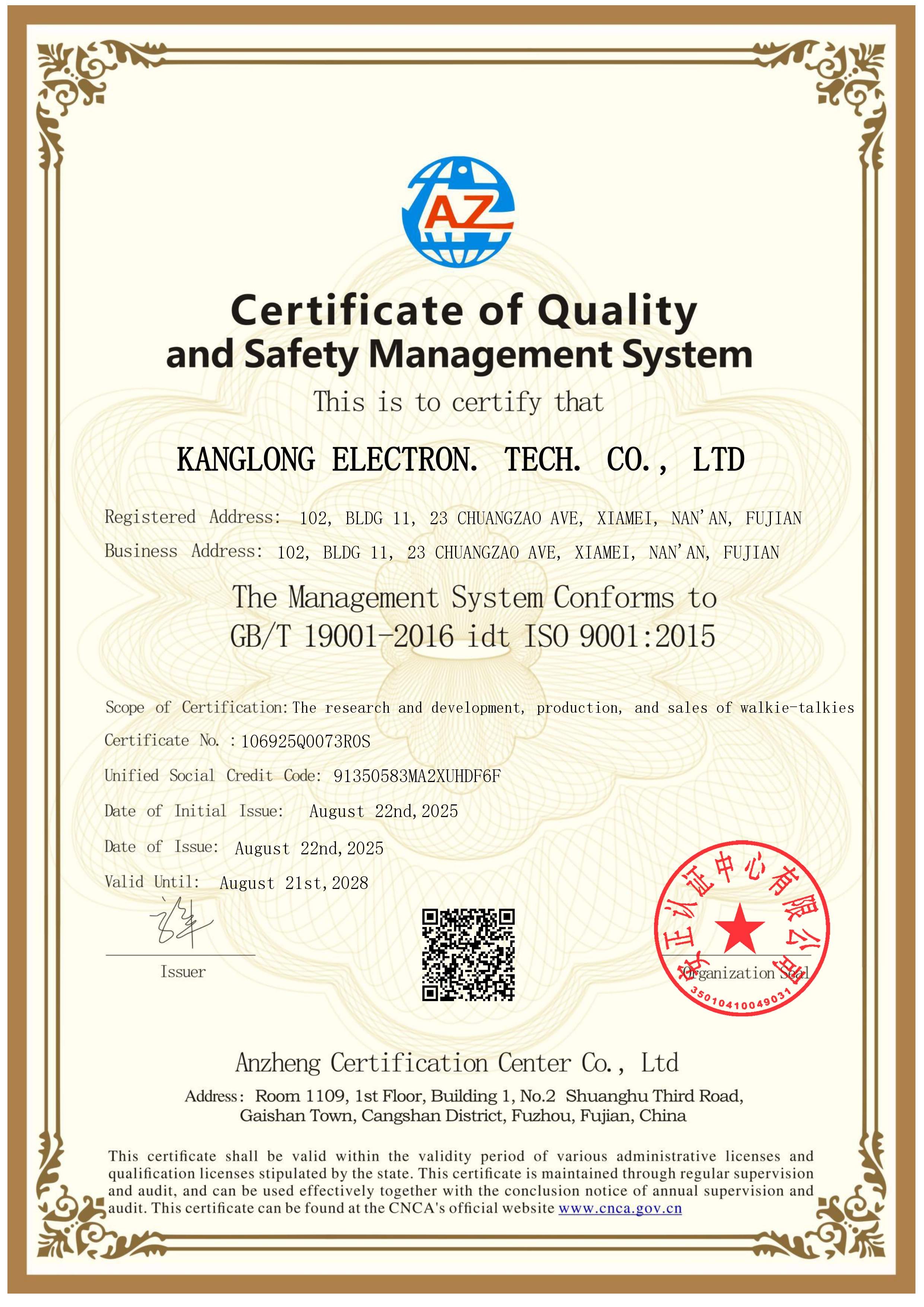 At KANGLONG Radio, we believe that trust is built on a foundation of proven quality and consistent processes. We are proud to announce that our manufacturing facility has been officially certified under the ISO 9001 Quality Management System. This internationally recognized achievement is not just a milestone for us—its a clear promise to our global clients and distributors of our unwavering commitment to excellence.