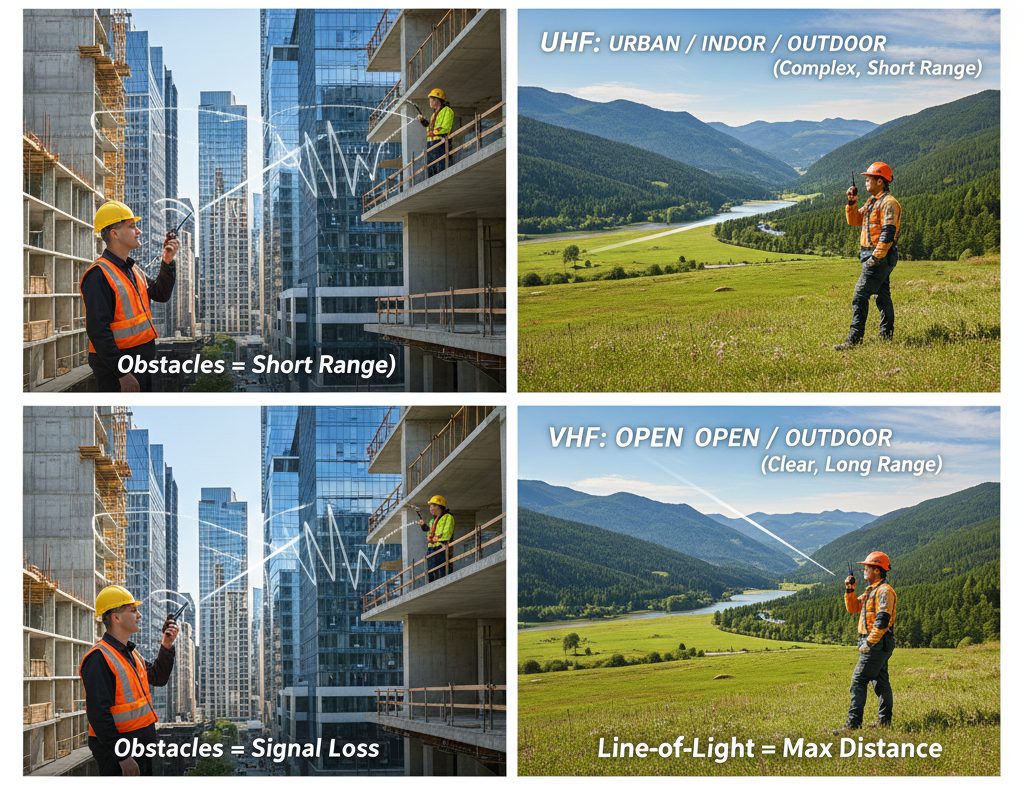 UHF (Higher Frequency): This is the sports car in a parking garage. Its shorter waves are excellent at penetrating light structures and bouncing off walls. Ideal for multi-story buildings, industrial sites, and dense cities—which is why the Motorola TRBO line often focuses on UHF for enterprise.
